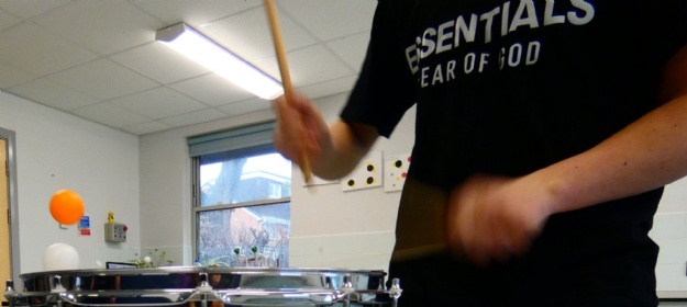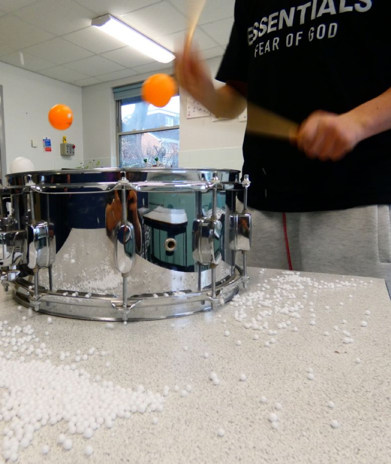 We went down to the Science Room armed only with the snare drum and a pair of drumsticks and took three table tennis balls out of the cupboard. While Lucas was playing, we dropped the three balls onto the skin of the drum to see whether the speed or volume of his playing would influence how high and far they bounced. Having established the connection, we then tried the same experiment with hundreds of tiny polystyrene balls. The effects were amazing, and the photos do not do them justice. If we staged a similar experiment again, we would place black card behind the drum so that the balls’ trajectory could be followed more closely.