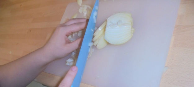 Hannah was working on her cutting skills, showing she is able to use a sharp knife to cut ingredients safely and correctly to cut the onions into small pieces.