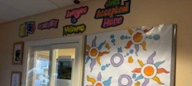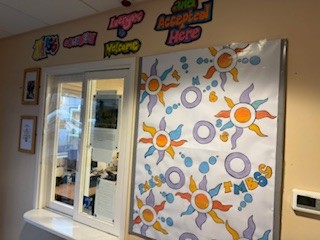 During enrichment sessions KS3 and 4 students created a new display for the Centre foyer, using parts of the logo, but broken apart into shapes and patterns, before adding the wording ‘everyone is welcome and accepted here’.