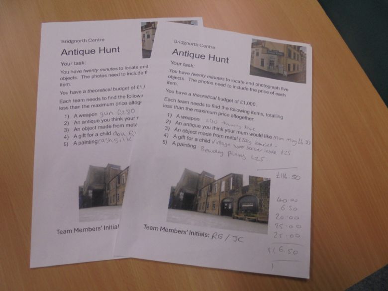 Armed with a theoretical budget of £1,000, teams set off on foot to the Old Mill Antiques Centre in Bridgnorth and were given twenty minutes to locate five items (including a gift for a child and a painting of their choice), noting down descriptions and costs for each antique.  This involved working out team expenditure and potentially negotiating a price to ensure they stayed within their agreed budget.  It was a good opportunity to explore historic artefacts and their provenance, as well as to engage in some positive teamwork. Needless to say, the students emerged victorious with the staff team’s forfeit being to splash out on milkshakes for the winners in the Centre Café.